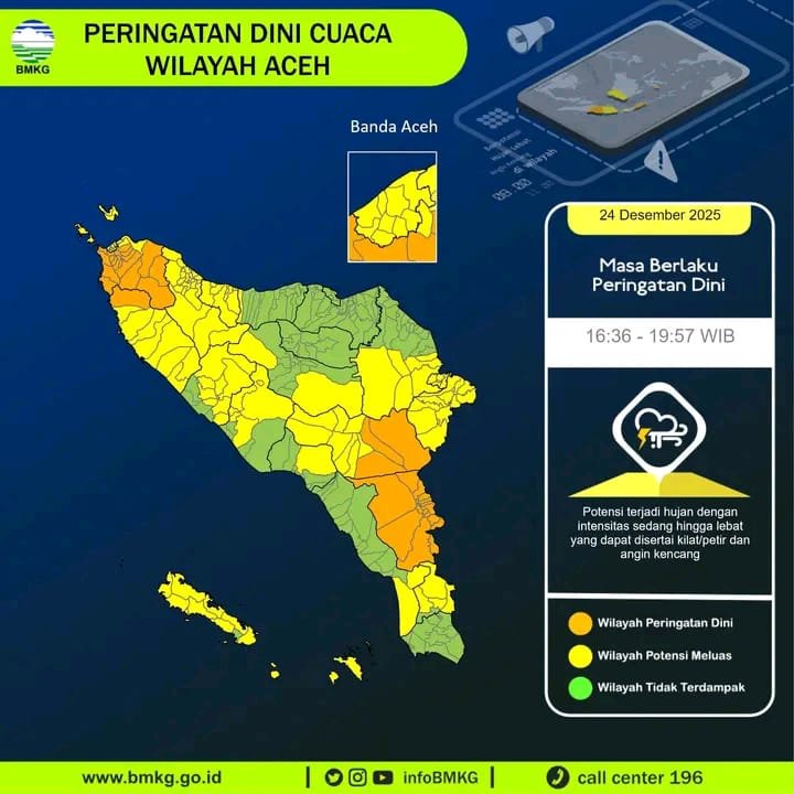 Aceh Tengah – investigatornews.id– Rabu, 24 Desember 2025 Badan Meteorologi, Klimatologi, dan Geofisika (BMKG) Aceh mengeluarkan peringatan dini cuaca ekstrem yang berpotensi melanda hampir seluruh wilayah Provinsi Aceh, Rabu (24/12/2025), mulai pukul 16.36 WIB hingga diperkirakan berakhir sekitar pukul 19.57 WIB.