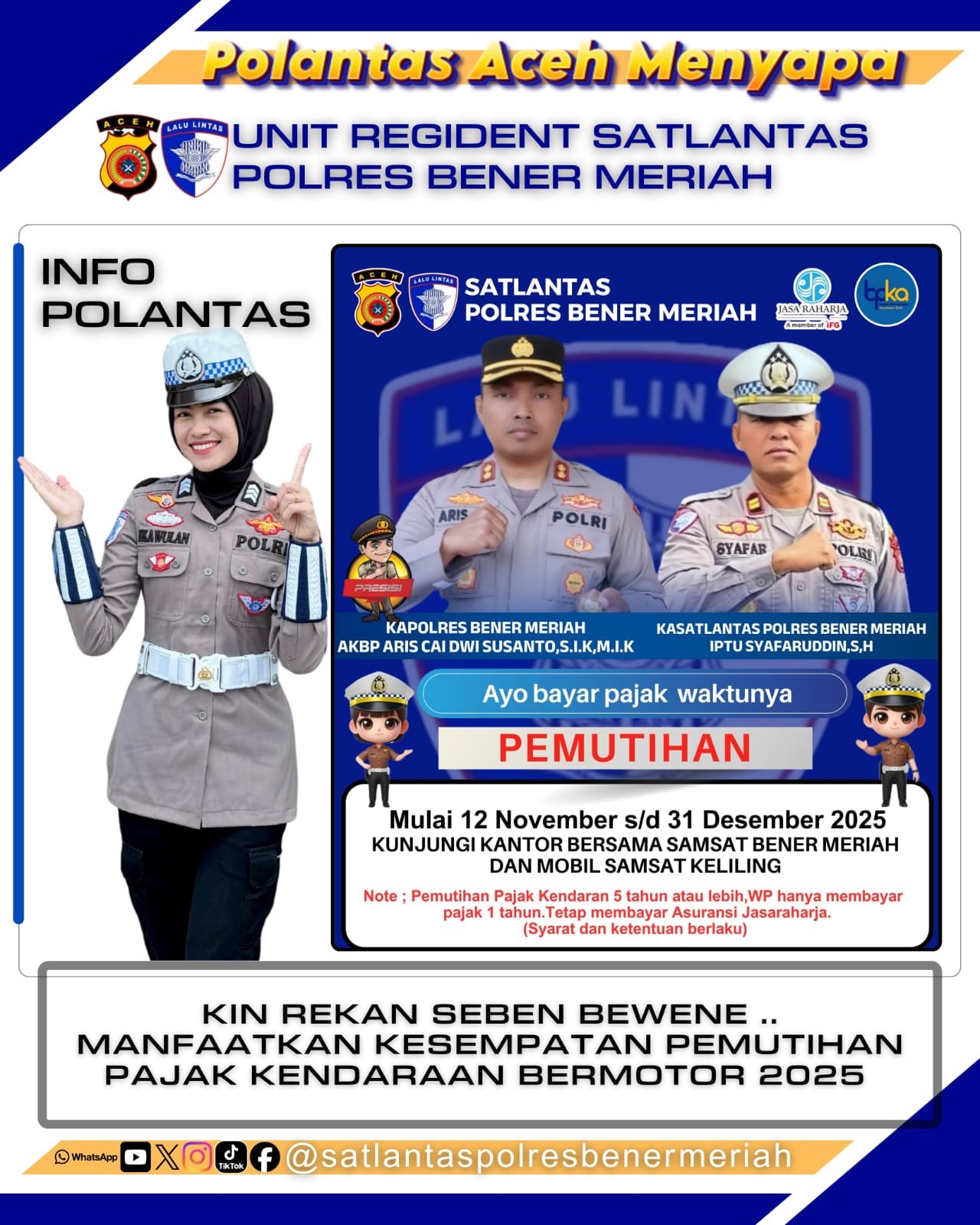 Bener Meriah, Investigatornews.id – Kabar baik datang untuk masyarakat Aceh, khususnya para pemilik kendaraan bermotor berplat BL (Aceh). Pemerintah Aceh melalui Badan Pengelolaan Keuangan Aceh (BPKA) bekerja sama dengan Dispenda seluruh Kabupaten di Aceh, dan Satlantas Polres Bener Meriah resmi memberlakukan program pemutihan pajak kendaraan bermotor tahun 2025, yang berlangsung mulai 12 November hingga 31 Desember 2025.