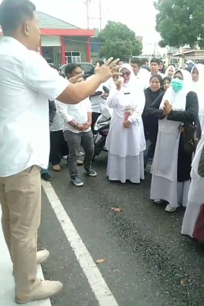 “Mari kita masuk ke ruang rapat untuk berdiskusi. Di sini ada wartawan, saya merasa kurang pantas membahasnya di luar,” ucap dr. Gusnarwin di hadapan para peserta aksi.