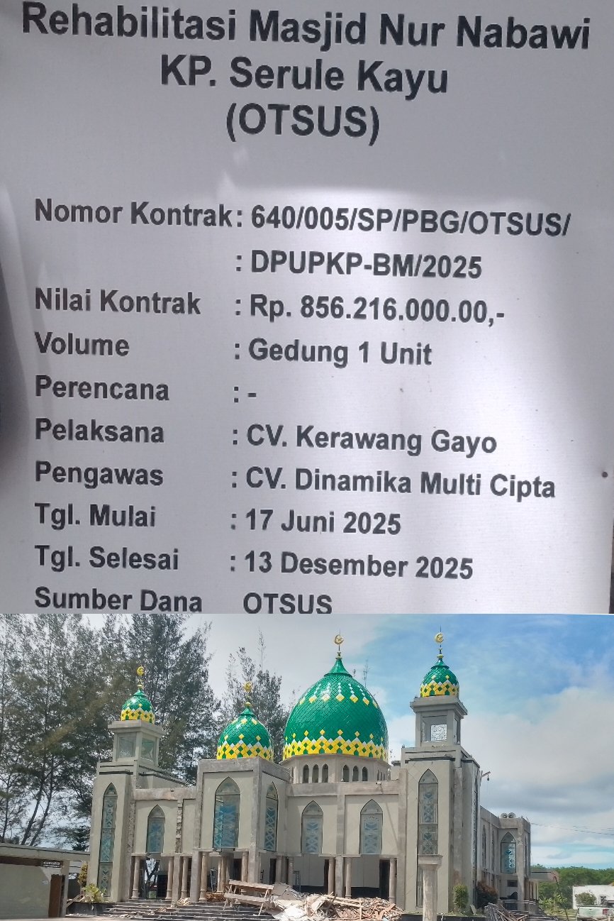 Bener Meriah- investigatornews.id-Proyek Rehabilitasi Masjid Nur Nabawi di Kampung Serule Kayu, Kabupaten Bener Meriah, dengan nilai anggaran Rp 856.216.000, hingga awal 2026 dilaporkan belum siap meski masa kontrak pekerjaan telah berakhir pada 13 Desember 2025.